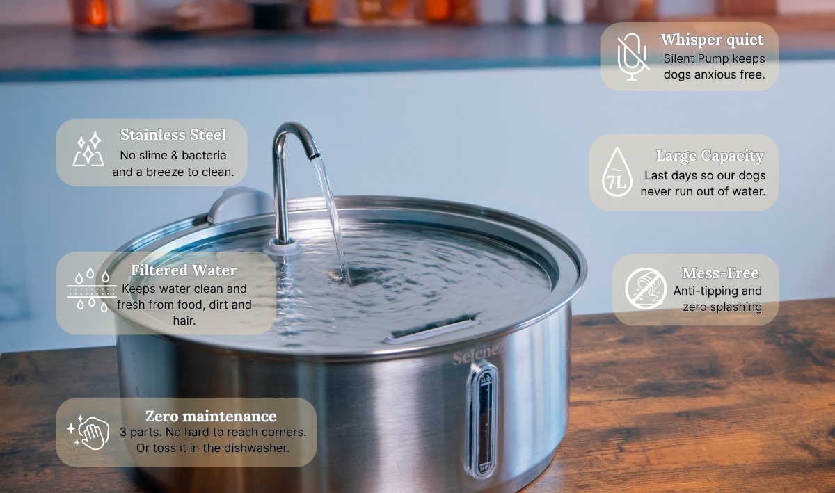 Unlike plastic fountains & bowls that get slimy and gross (you know that weird film that builds up?), stainless steel naturally resists bacteria and mold, and doesn't have to be cleaner as often.