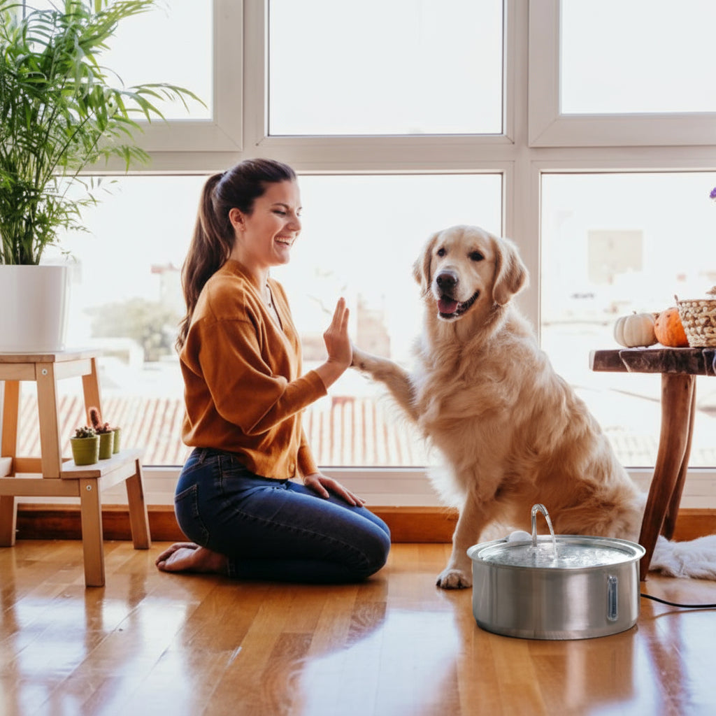 Like you, we love our dogs and care about their health. That's why we created the Doggy Fountain. Regular water bowls collect hair, dust, and that slimy film, making our dogs drink less than they should. The Doggy Fountain keeps water flowing, filtered, and fresh with stainless steel that never gets gross. So our best friends stay hydrated, healthy, and full of energy, while we get peace of mind.
